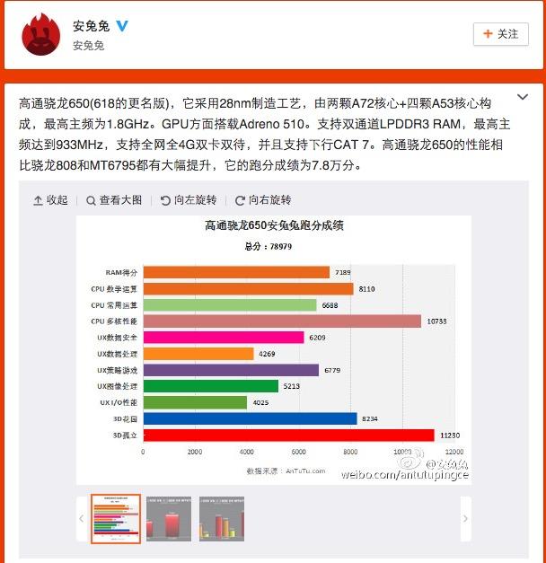 安兔兔更是列出了骁龙650处理器、MTK6795、骁龙808处理器三者的性能对比。而从结果上看,无论是CPU性能还是芯片的综合性能,骁龙650都要比其余两者优秀。