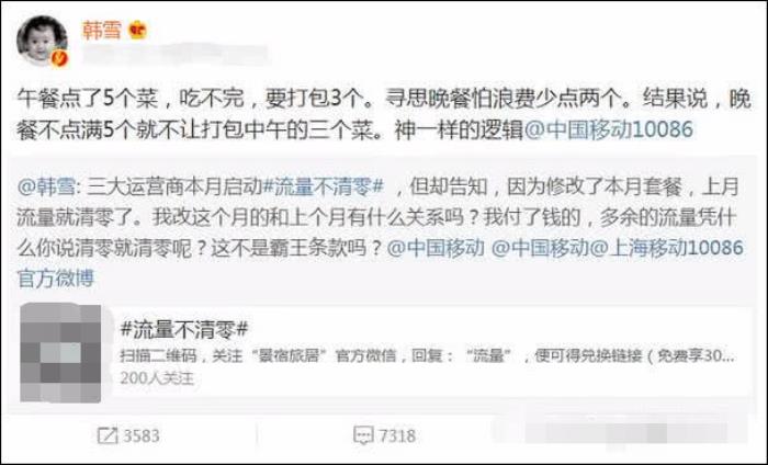 韩雪长相甜美,一直都是高冷范儿,敢说敢做的性格也是圈了不少的粉,近段时间关于韩雪怒告中国移动的事件引起了网友热议,韩雪发文斥责中国移动,其实这种情况发生在普通人身上的也有很多,只是一般人也告不起来啊,韩雪作为明星,也是为老百姓们做了一件大事,自从韩雪斥责了移动之后流量到月底就不清零了。