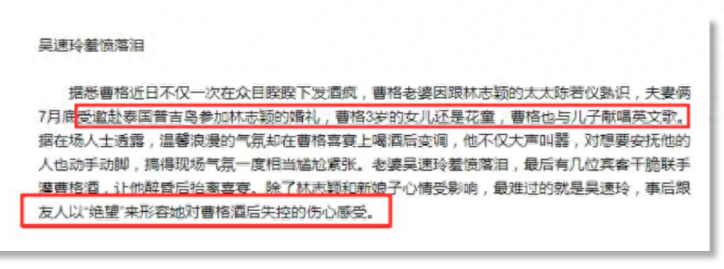 结婚后,曹格易怒、酗酒的性格给夫妻关系和个人事业都带来了太多危机,酒后闹事的新闻一抓一大把,和侧田对打啦,在海外温哥华大闹啦,两次都找来警察受到处罚,2013年曹格更在林志颖的婚礼酒后闹事,吴速玲感到十分丢脸愧疚。