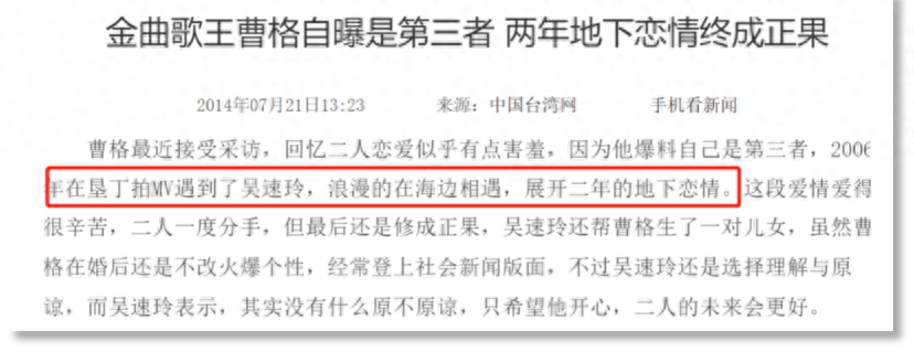 曹格2008年与吴速玲登记结婚,当年儿子就出生了,属于先上车后补票。当时还传出曹格是第三者,他与身为造型师的吴速玲相爱时对方是有男友的。