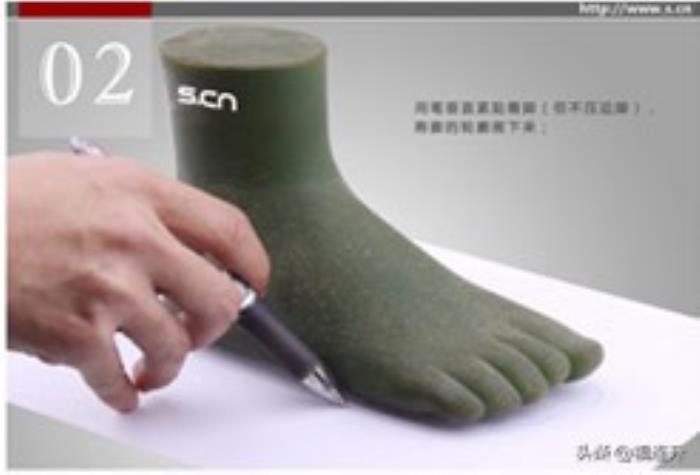 用笔垂直紧贴着脚(但不压迫脚),将脚的轮廓画下来;