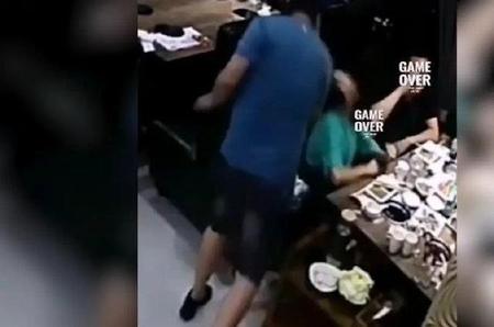 7月2日晚上21:00左右,一名身穿蓝色上衣的男子走入火锅店,来到两男一女的餐桌前。猛然动手打向坐在外侧女子的脸部,女子猝不及防,倒向一边。接着又拿起酒瓶向另外两名同桌的男子打去。
