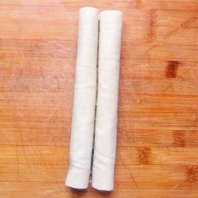 4、将豆皮裁剪摆摊成和海苔一样的大小,然后在豆皮表面豆皮抹上水,鸡肉卷的做法,香蕉鸡肉卷的做法,再把海苔贴上去