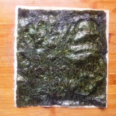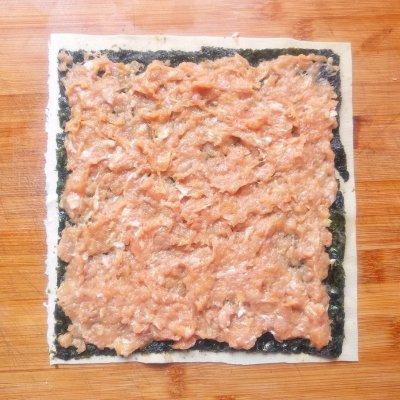 5、然后把腌制好的培根北京鸡肉,鸡肉卷的做法摆摊,鸡肉卷的做法儿童,鸡肉卷的做法墨西哥,鸡肉卷的做法肯德基,老北京鸡肉卷的做法,均匀的抹空气在海金丝苔表面肉卷