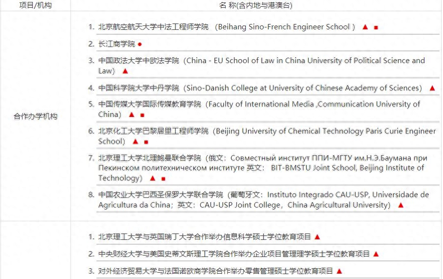 具体学校名单可以查看以下链接,由教育审核并予以公布的学校如下:硕士及以上中外合作办学机构与项目(含内地与港台地区合作办学机构与项目)名单 中华人民共和国教育部 中外合作办学监管工作信息平台(https://c.quk.cc/2/c7/a1t3ard1chx >