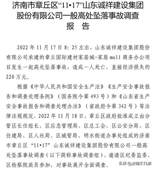 日前,济南章丘公布山东诚祥建设集团高坠事故调查报告。