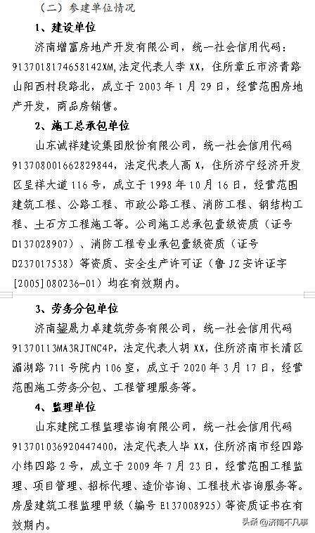 据了解,该项目建设单位为济南增富房地产开发,施工总承包为山东诚祥建设集团,劳务分包为济南鋆晟力卓建筑劳务,监理单位为山东建院工程监理咨询。