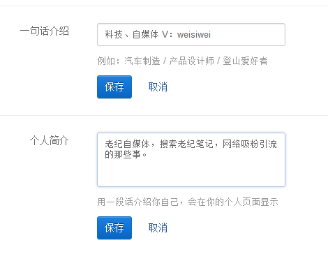 2、然后就是设置引导。编辑资料里面有【一句话介绍】介绍自己的微信、QQ之类的,具体看你是推广什么的;另外一个是【职业经历】,有多牛逼就吹多牛逼吧,当然也得符合实际,比如你取一个“马曼琳”的名字,然后职业经历上填写腾讯CEO助理,然后在推广的时候,光名称和职业就给你加分了。最好是100%的完善资料,最后加一个合适的头像,那就算是设置引导完了。