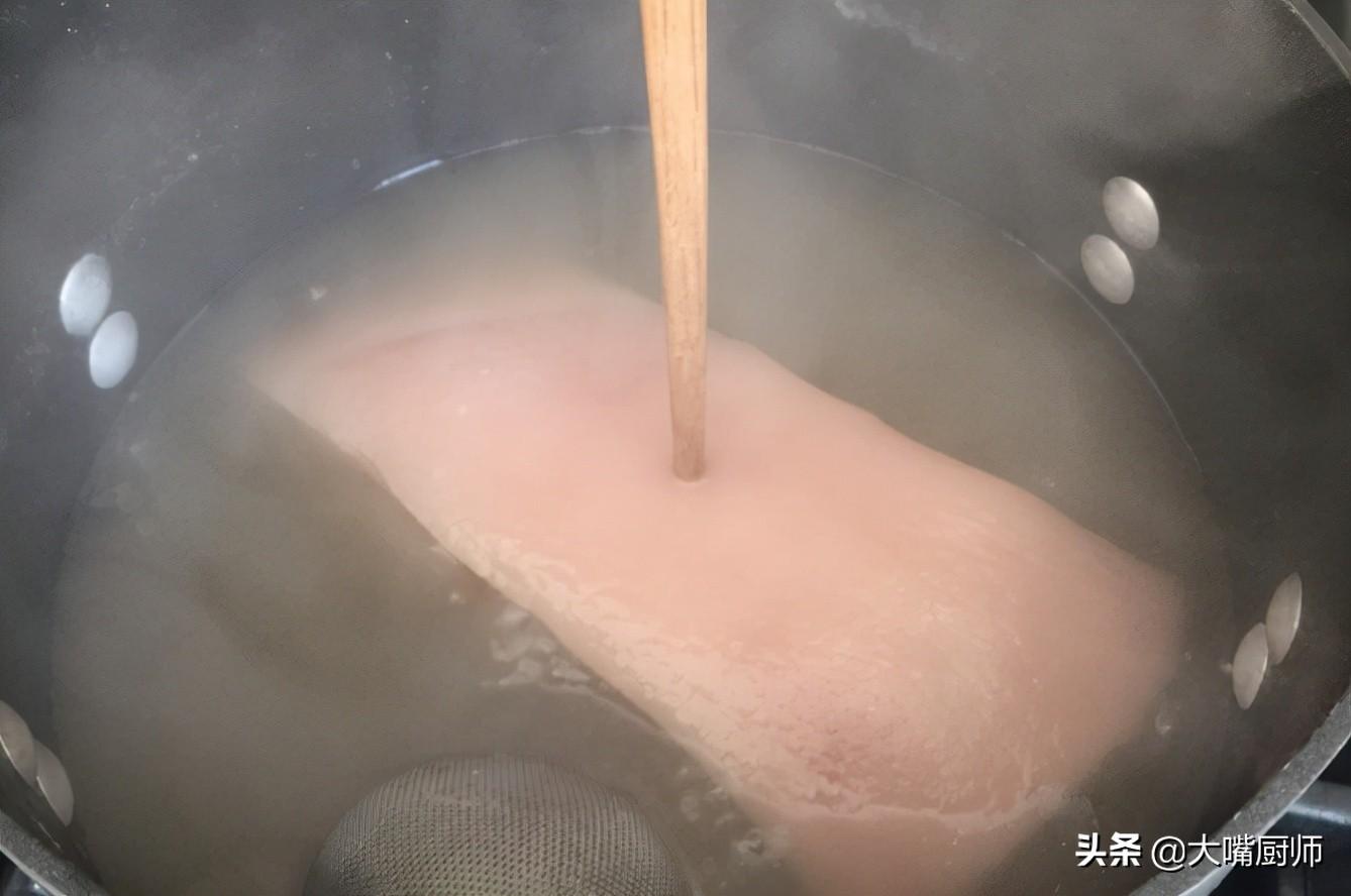 2、二刀肉要提前煮熟,用筷子扎透即可,并用冷水浸泡。