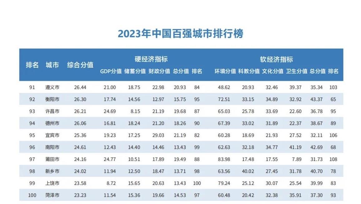 菏泽位居排行榜的第100位,上饶则是新晋百强城市中的第99位,而滨州退出了百强城市行列。