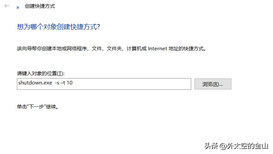 第二步:在请键入对象位置处填:shutdown.exe -s –t 1