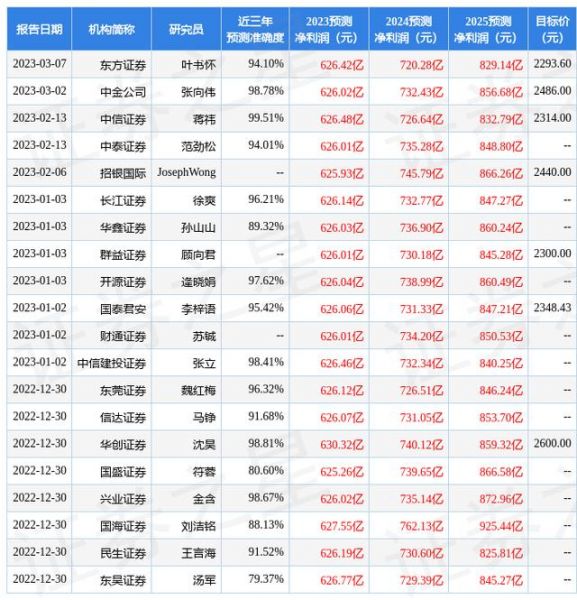 证券之星数据中心根据近三年发布的研报数据计算,中信证券蒋祎研究员团队对该股研究较为深入,近三年预测准确度均值高达99.51%,其预测2023年度归属净利润为盈利626.48亿,根据现价换算的预测PE为36.14。