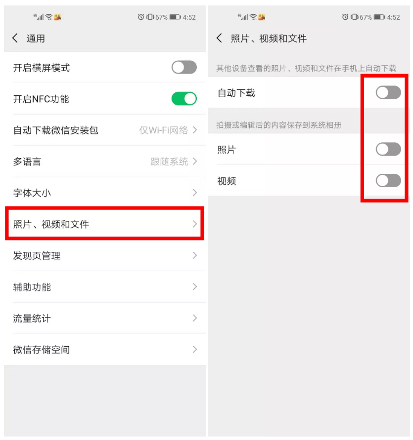 在「微信」中,我们可以在「设置」—「通用」—「照片、视频和文件」里关闭「自动下载」、「照片」、「视频」等三个选项,防止微信一言不合就帮你自动保存了不必要的大文件。