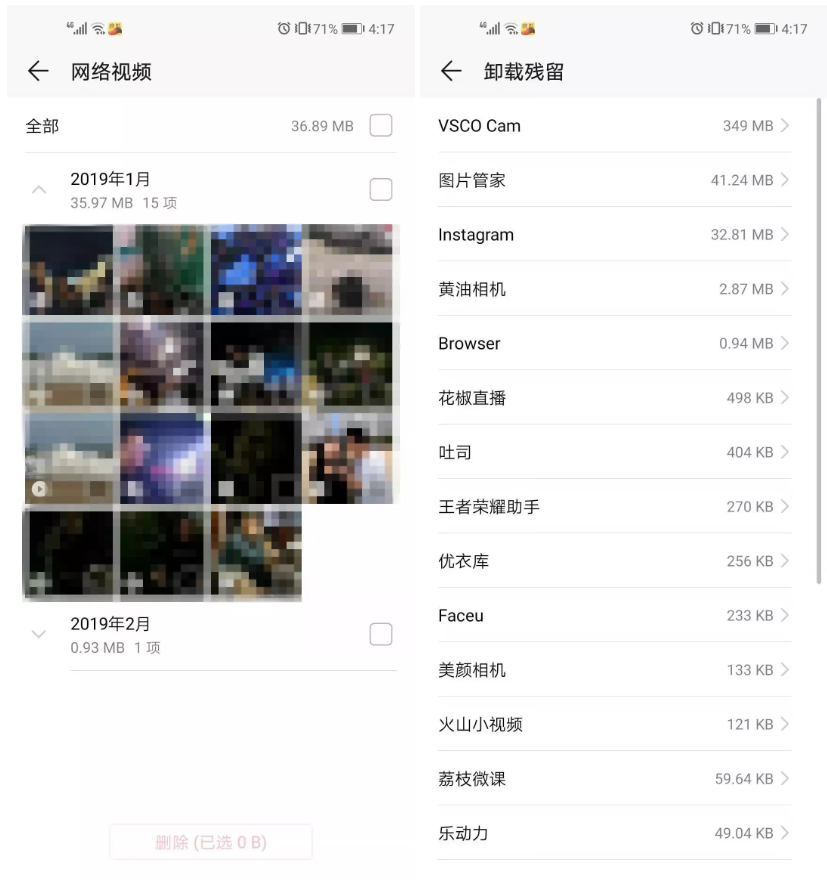 而在「专项清理」中,新版「手机管家」会自动帮你归纳和识别出手机中模糊相似的图片、视频、应用、安装包等等文件,从中你才会发现,原来手机中还隐藏了那么多内存大且不经常使用的文件,它们在一直占用着手机的资源,这次终于“原形毕露”了。