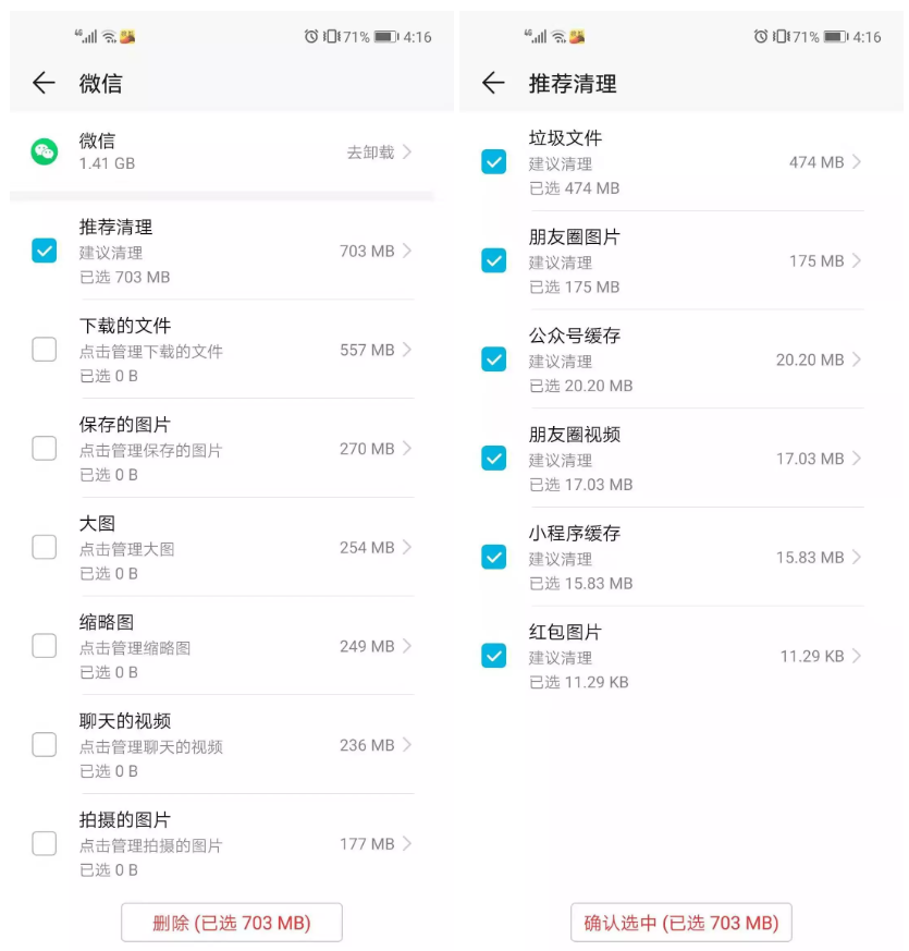 在「应用占用详情」中,我们可以看到每个APP所占用的内存大小,如「微信」中还可以看到更加细化的内存占用情况,根据你的需求进行选择和删除即可。