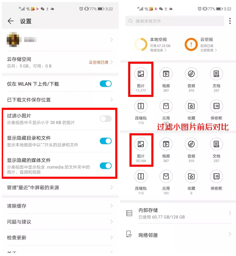 另外,点击右上角的「设置」,还可以选择关闭「过滤小图片」,开启「显示隐藏目录和文件」、「显示隐藏的媒体文件」来发现隐藏最深的小文件,别看这些文件虽小,但数量却是非常的大呢。
