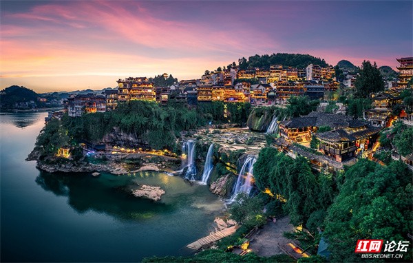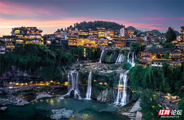 图说:湘西,这个神秘而又美丽的地方,总是让人心驰神往。对它的最初印象,是因为沈从文笔下的《边城》。本来以为凤凰古城的灯火辉煌够迷人了,直到遇到了芙蓉镇的华灯初上。终于有一天,我来到了这里。这座建在瀑布上的千年古镇,也是刘晓庆拍摄电影《芙蓉镇》的取景地。古色古香的吊脚楼群错落有致,在暖黄色灯火的映衬下,仿佛天上宫阙。