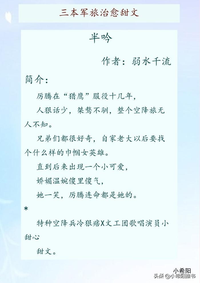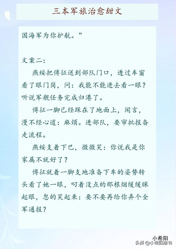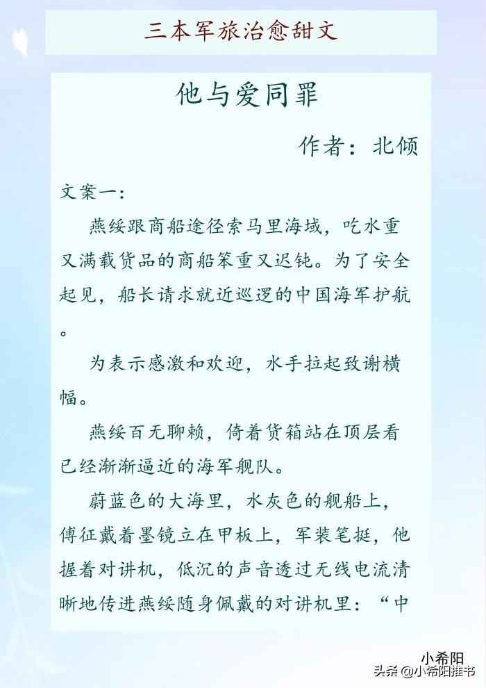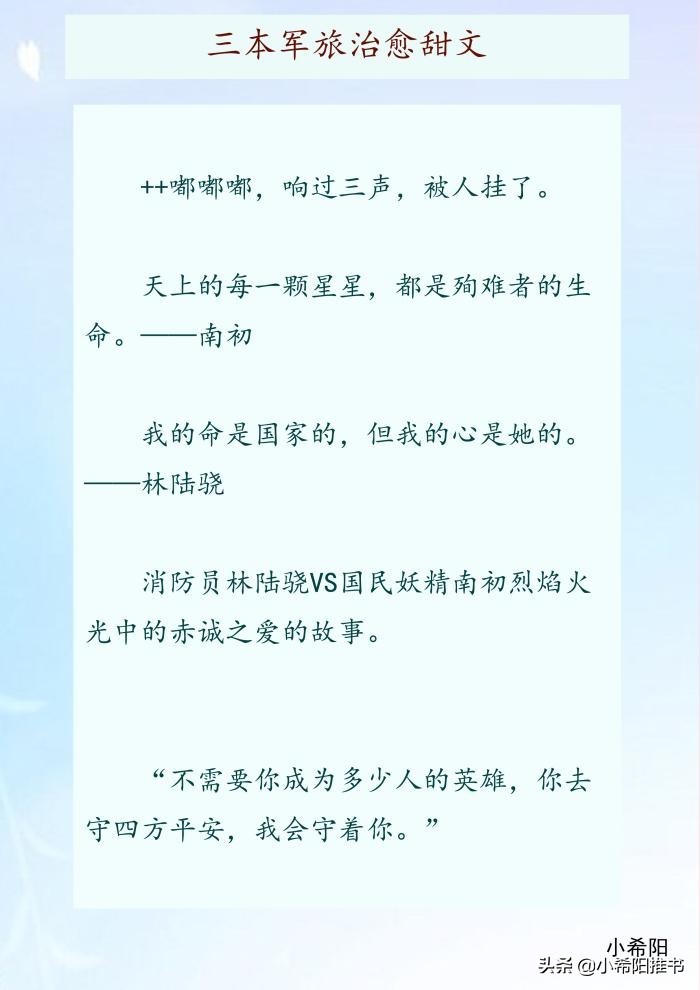 今天推荐三本现代军旅甜文,男主的设定都是为国献身,可以为之付出一切的军人,外表冷厉,但他们的内心也有一处柔软地,除了国家,还有你。我守护国家,你守护我。