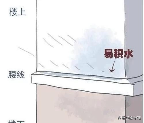 雨天积水易内渗,墙体发霉难处理。随着人们审美观的提升,建筑商为了迎合消费者,不仅要在楼内格局上下功夫,楼房整体造型上做文章,腰线造型也就由此频繁出现。然而这些造型通常都突出普通墙体,一旦遇到下雨天,极易造成雨水堆积,并且内渗至住户家中,浸湿墙面,造成墙体发霉、墙皮脱落等情况,不仅会影响室内美观,还很难处理。