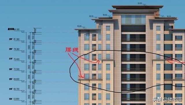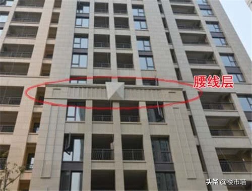 所谓的腰线房,就是建筑商为了装饰楼梯而设置的一些造型独特的挑梁,一般隔几层或是在某一层出现,这些房屋就被称为腰线房,或者是造型层。