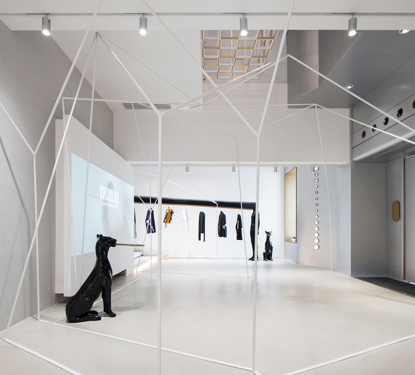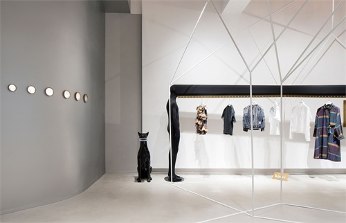 以独特的衣帽杆设计为例,衣帽架虽具有极高的使用性,却总是被以最隐晦的造型语言加以设计,最后成为墙角边不起眼的存在。但CHOCLAB却替换角度概念,将如此实用的设备摇身一变,成为店铺陈列空间的最为“抓马”的主角。人形模特式的陈列架,夸张且特殊的形象概念,彻底颠覆大众对于衣帽架在买手店中所出现的印象,既满足了当季衣款陈列的功能,又呼应了店铺主旨为顾客“潮人”服务的寄望。