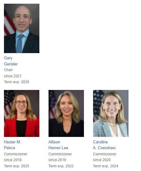美国总统还指定其中一名委员担任主席,即美国证券交易委员会的最高执行官。2022年在任的委员分别是: