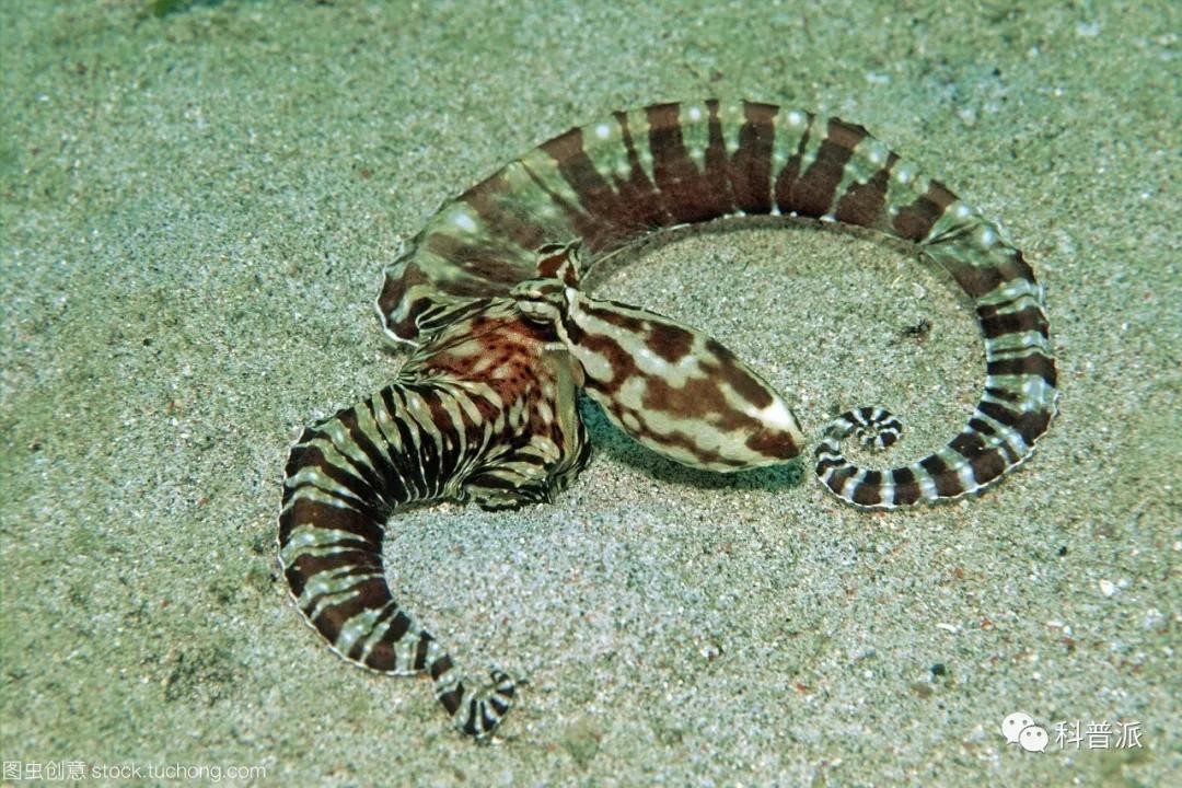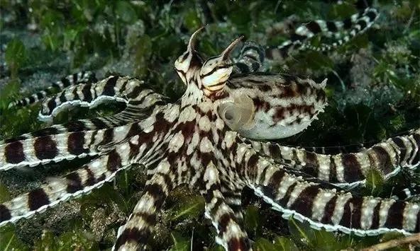 拟态章鱼是一种海洋生物,是自然界中顶级伪装高手。这种身体非常软的动物可以任意改变颜色和形状,正常体色是带着斑点的褐色,可模拟多种环境和其他海洋生物,比如:比目鱼和海蛇等。
