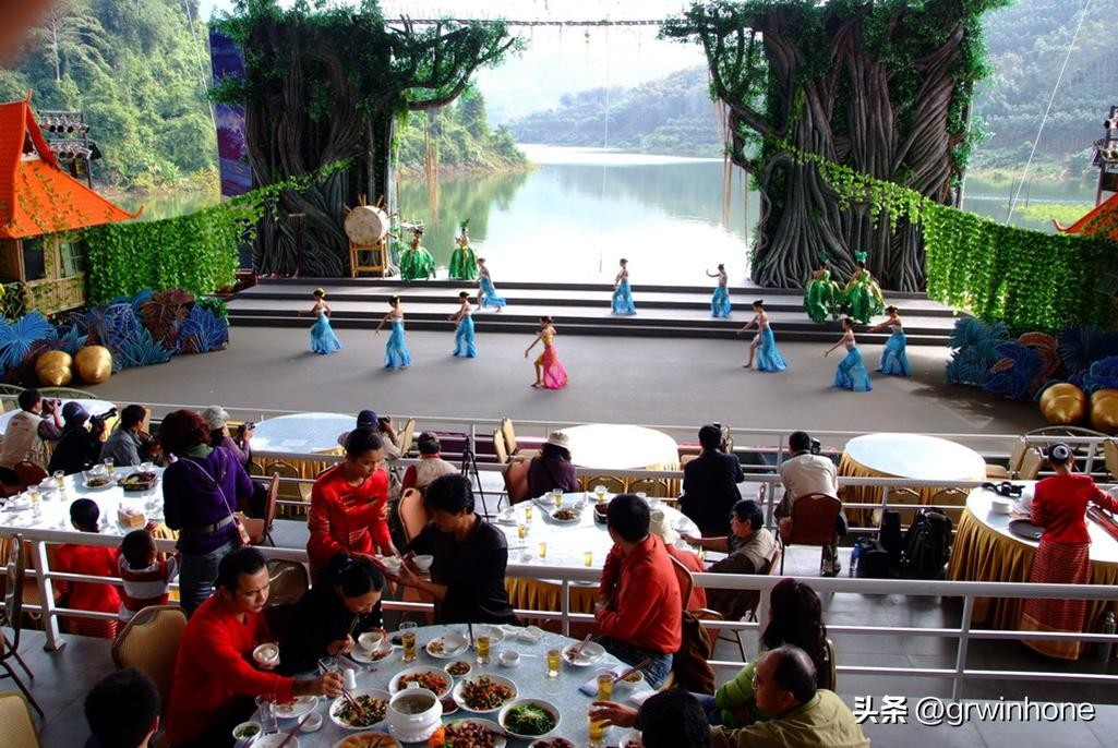 “望天树雨林餐厅”可以边吃饭边欣赏特色民族表演。Enjoy features ethnic performances during meals in Rainforest Restaurant