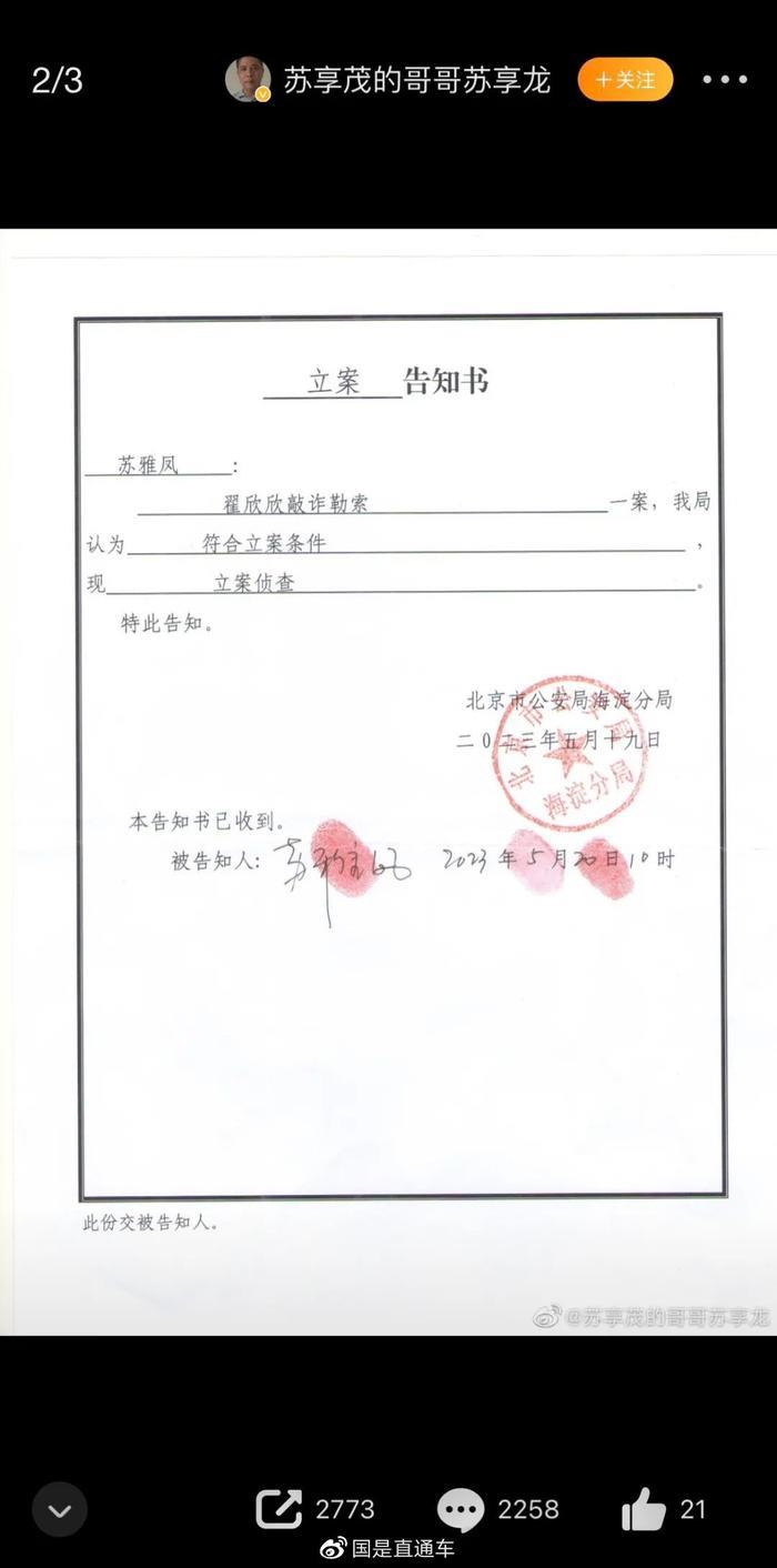 6月9日,微博认证账号为“苏享茂的哥哥苏享龙”发布消息称,翟欣欣已被逮捕并羁押于某看守所。他所发《立案通知》图片显示,“翟欣欣敲诈勒索案”一案,北京市公安局海淀分局认为“符合立案条件”现“立案侦查”,通知发出时间是2025年5月19日,家属第二天签收。
