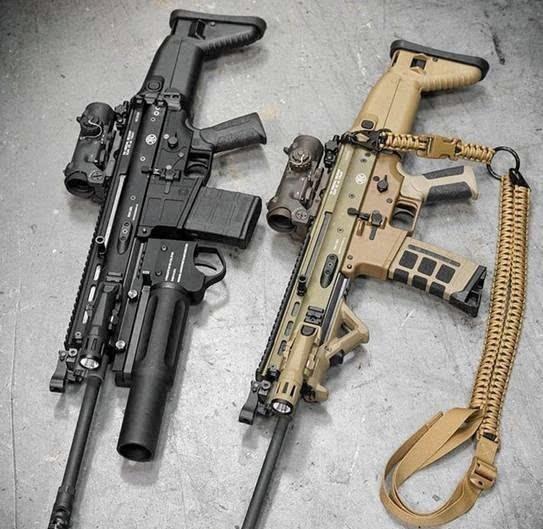 比利时FN旗下,专为美军特种部队研制的一种,特种战斗步枪,其实属于突击步枪的一种。因为作为特种兵的专属武器,可能会面临各种未知变化的战况,所以采用了模块化设计,机匣顶部带有一整条皮卡汀尼导轨,能根据实际情况所需,来安装各类瞄准镜,还包括上面的机械瞄准具也可以随意拆卸。该枪被美军命名为MK16/17 Mod 0,分为两种口径型号,发射5.56x45mm弹药的属于轻型版,也就是MK16或L型,发射7.62x51mm弹药的属于重型版,也就是MK17或H型,轻型版的SCAR就是标准的突击步枪,重型版的SCAR必要时,可以安装加重型长枪管,配备双脚支架和高倍瞄准镜,当作精确射手步枪使用。