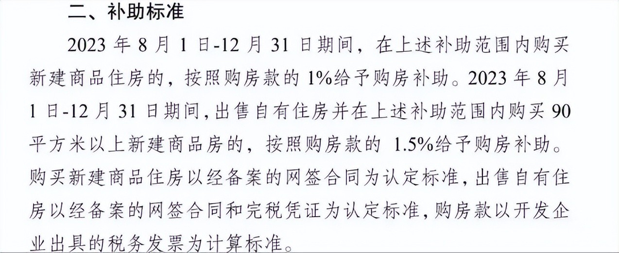 补贴范围:2023年8月1日至12月31日购买的新建商品房补偿比例:买新房补贴1%,卖旧房再买新房补贴1.5%