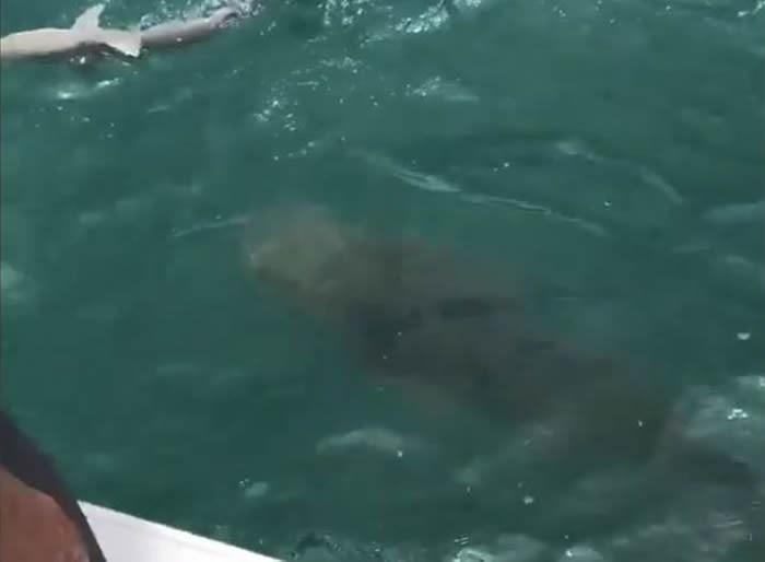 在一名参与者拍摄的视频中看到,当这群渔夫们想从距离美国佛罗里达州大沼泽地市岸边20英里的海里拖拽上一条长一米的鲨鱼时,一条大西洋的巨型石斑鱼游过来并整个吞掉渔民们捕到的鲨鱼。