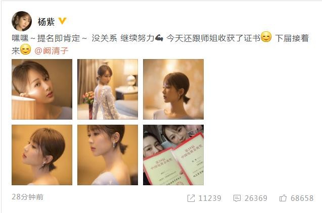 稍晚些,杨紫发文回应:“嘿嘿~提名即肯定~没关系 继续努力,今天还跟师姐收获了证书,下届接着来@阚清子”。
