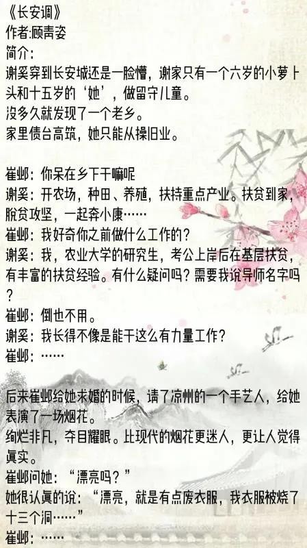 《长安调》我记得当初追书追到凌晨两点半,我真的好爱这篇,作者的文字真美,所描所述都让人身临其境的喜悦,非常好看的一本书,细水长流,文笔朴实但是十分打动人,特别是角色塑造十分立体,男主的温柔,女主的纯直,悦然纸上。对于男二确实有点意难平,但是感觉这就是这个角色会走的路,总而言之,非常好看!