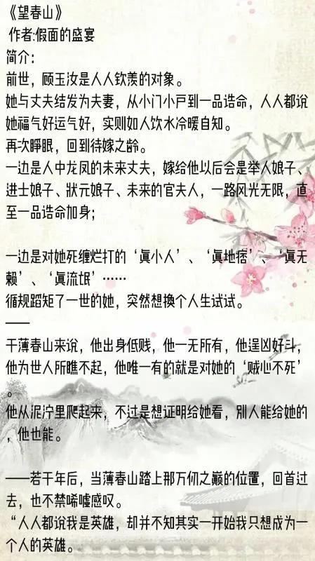 《望春山》这本是全篇一口气看完,觉得男女主真的天生一对,太般配。女主聪慧又理智,一直背后默默支持、鼓励男主,男主虽然看着有点不正经,实际上永远把女主放在第一位,两人始终双向奔赴,超甜,可以说是古言金榜文,强推一下。