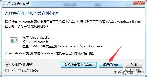 3.在弹出的“程序兼容性助手”对话框中点击“运行程序”(若有“恶意软件保护”程序请点击运行)