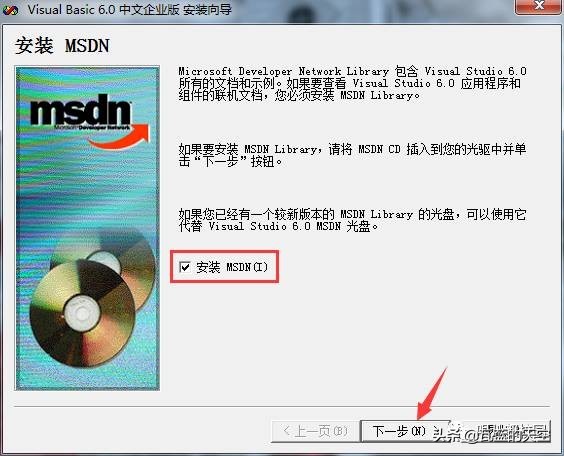 17.可自行选择是否安装MSDN。不需要安装的话,MSDN不要勾选。需要安装的点击“下一步”后选择安装包文件夹即可。(由于光盘中无msdn集合,所以不要选安装MSDN,点击下一步)