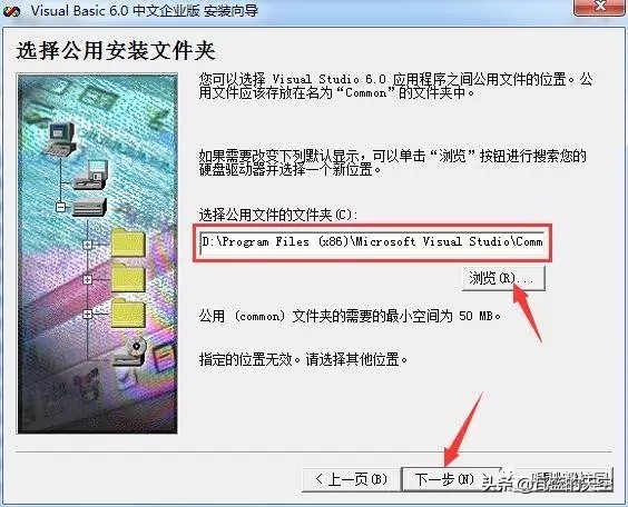 8.点击浏览更改文件位置,默认安装在C:\Program Files (x86)\Microsoft Visual Studio\Common(建议安装在除C盘以外的磁盘上,可在D盘或其它盘新建文件夹Common或者直接将C改成D)然后点击“下一步”。注意:文件夹名为Common