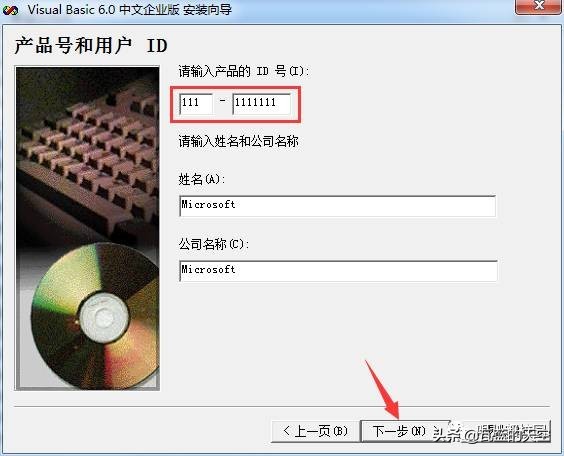 6.输入产品的ID号:111-111111,姓名、公司名称任意填写,然后点击“下一步”