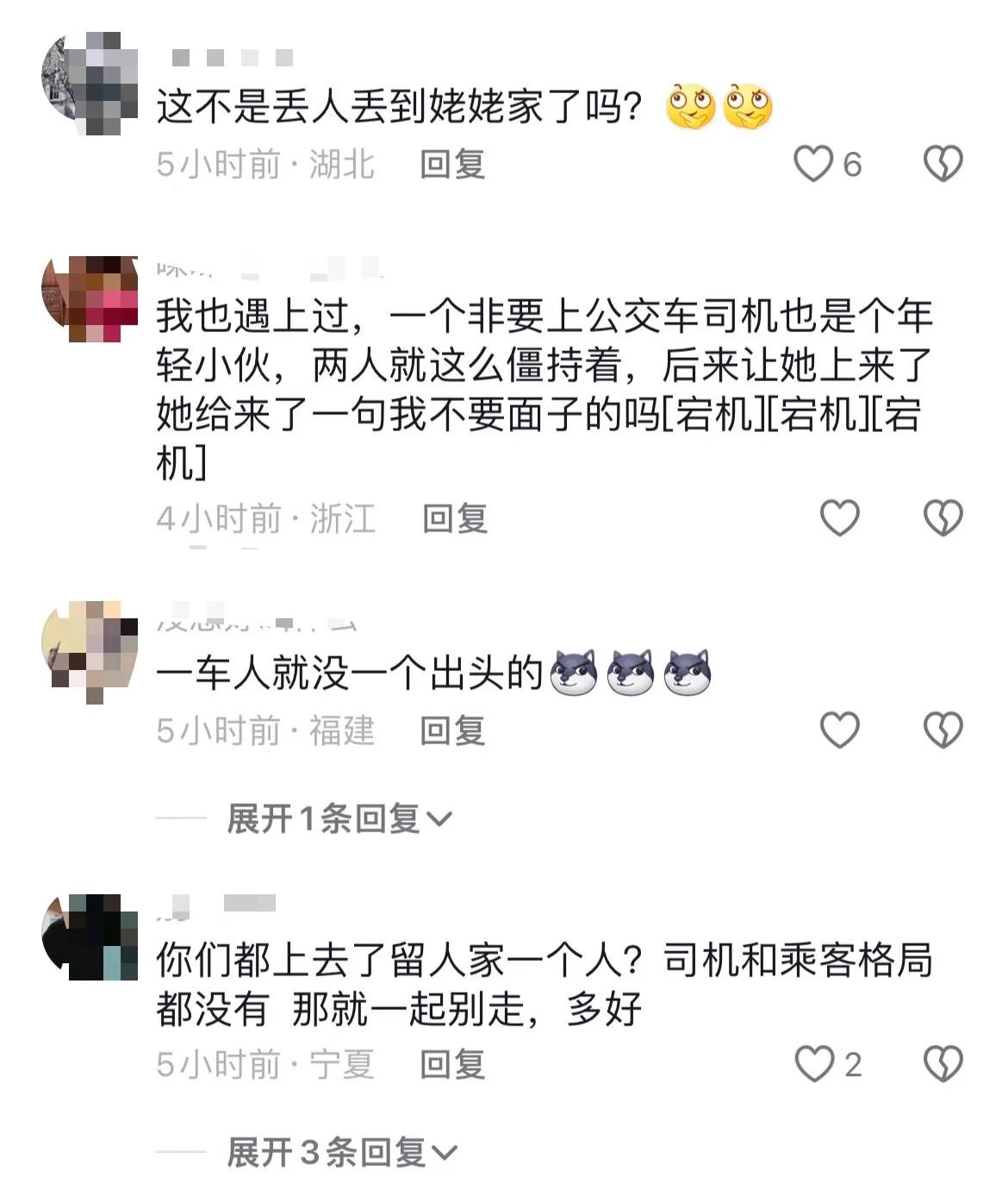网友B说: 我也遇上过,一个非要上公交车司机也是个年轻小伙,两人就这么僵持着,后来让她上来了她给来了一句我不要面子的吗[宕机][宕机][宕机]