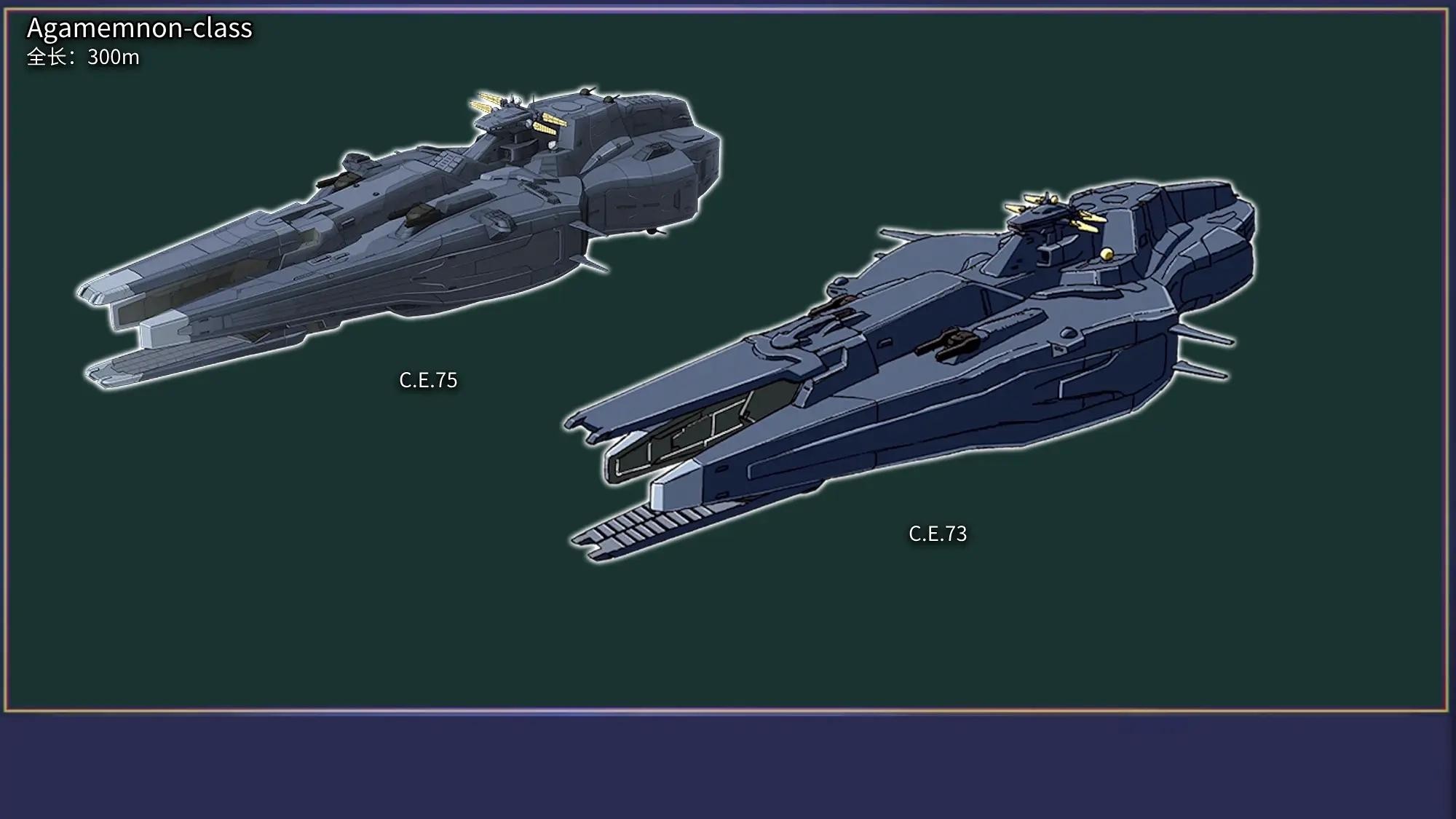 接着到了C.E.75年,地球联合又对阿伽门农级的武装进行了加强,使得这时期的阿伽门农级战斗力发生了质的变化。然而在与Foundation王国的战争中,改进后的阿伽门农级并没有什么亮眼的表现。