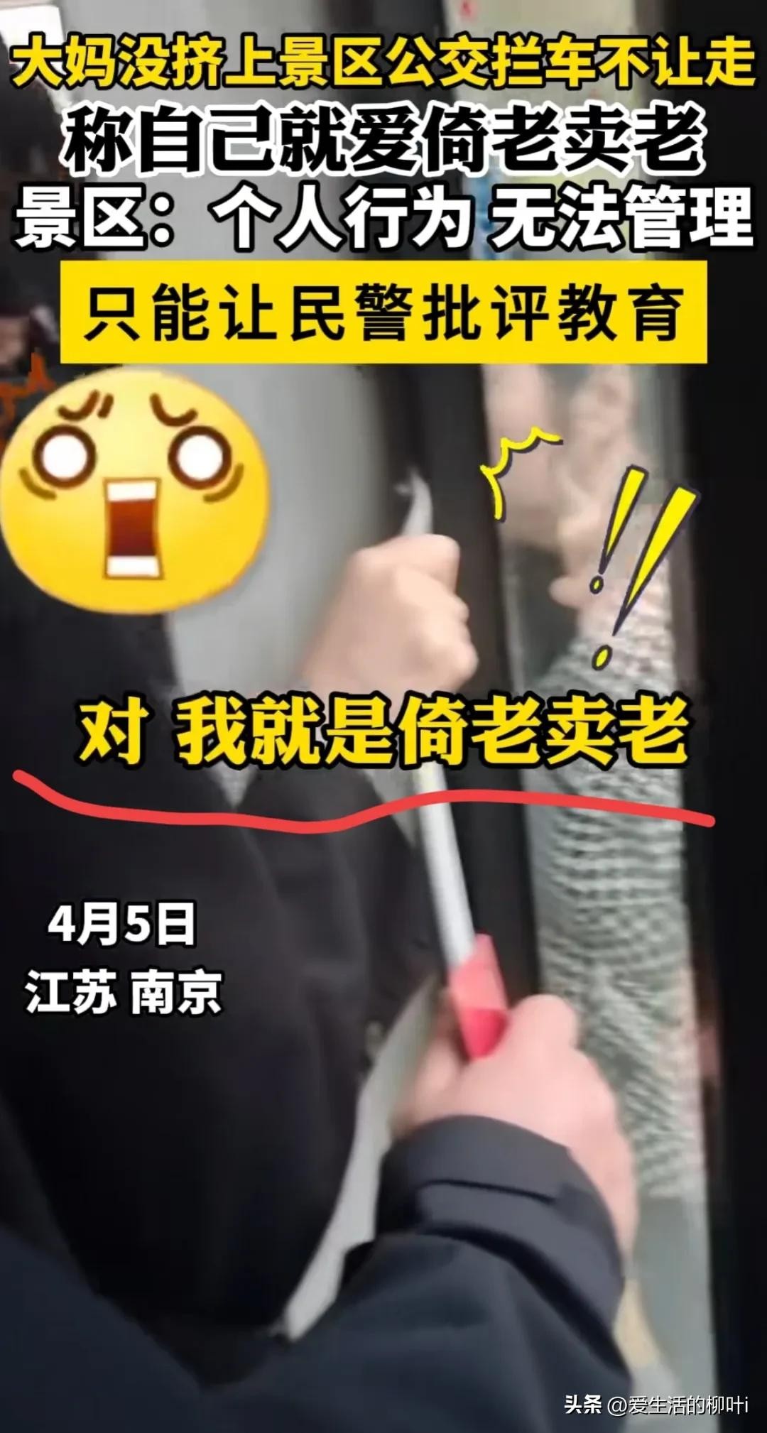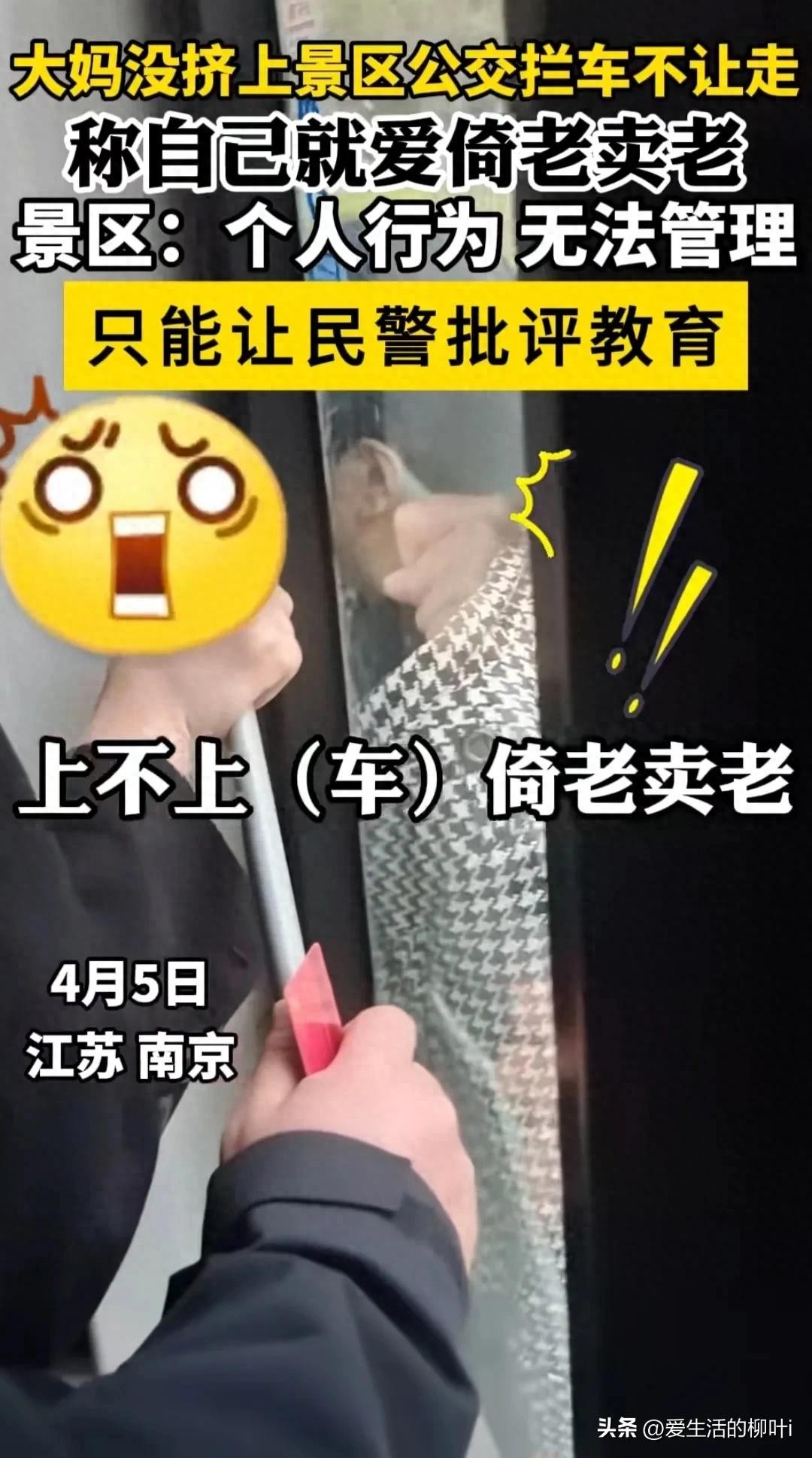 在江苏南京的牛首山景区,一位大妈因未能挤上景区的接驳公交车,做出了令人震惊的举动。她身着米色外套,站在车前,坚决不让公交车离开。