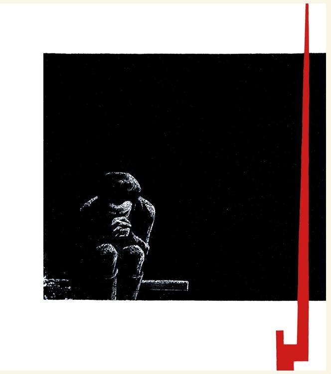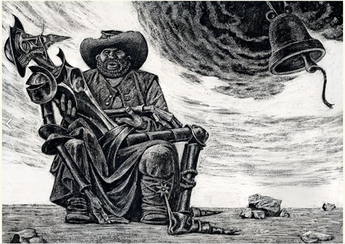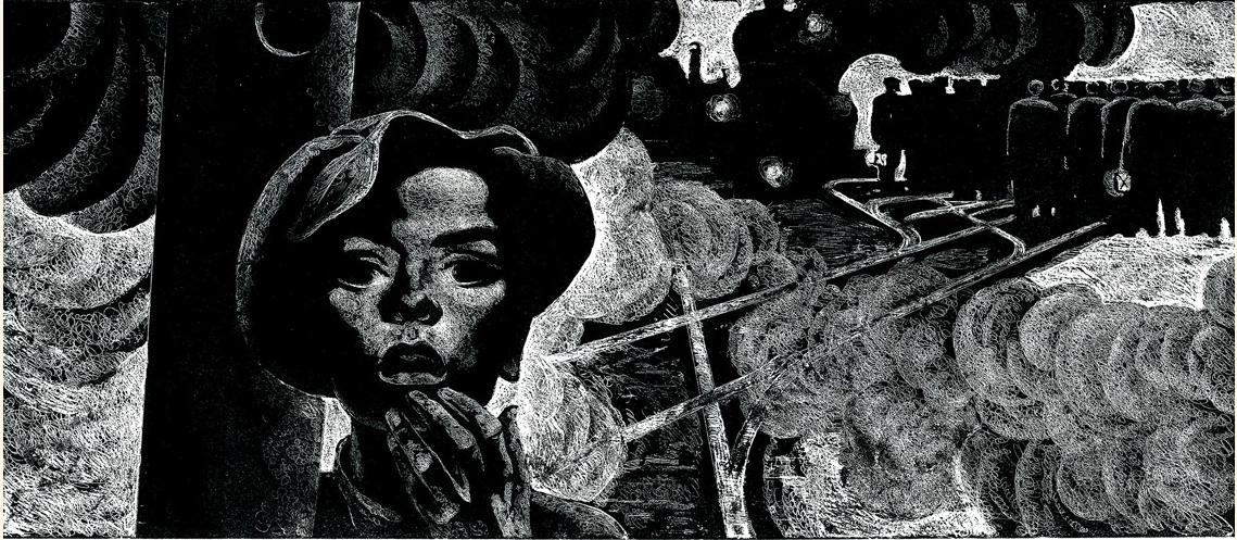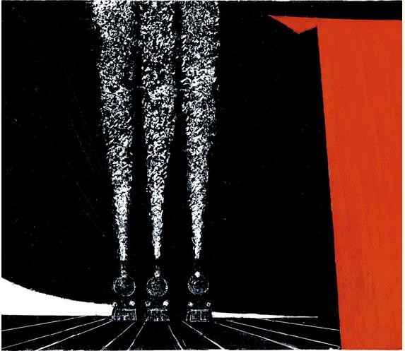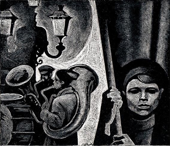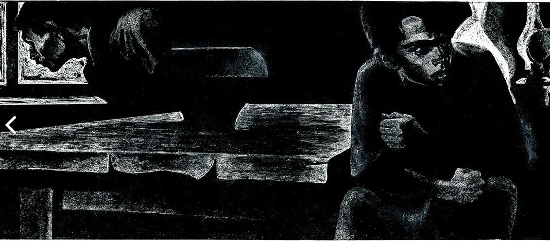 绘者显然从过去我们熟知的写实图象中,提取出带着黑暗气质的精神内涵,用他的刀劈斧削的笔触镂刻出来,整个画面给人一种强烈的压力感,挥发着一种历史的沉重的呼吸与味道,让我们熟悉的生活化的画面,具有了形而上的内涵与意义。