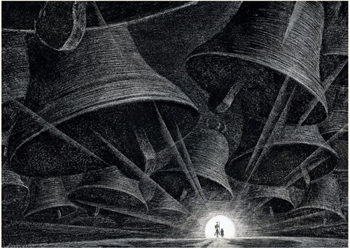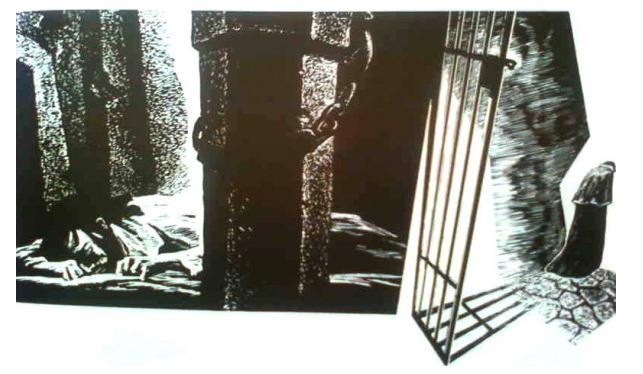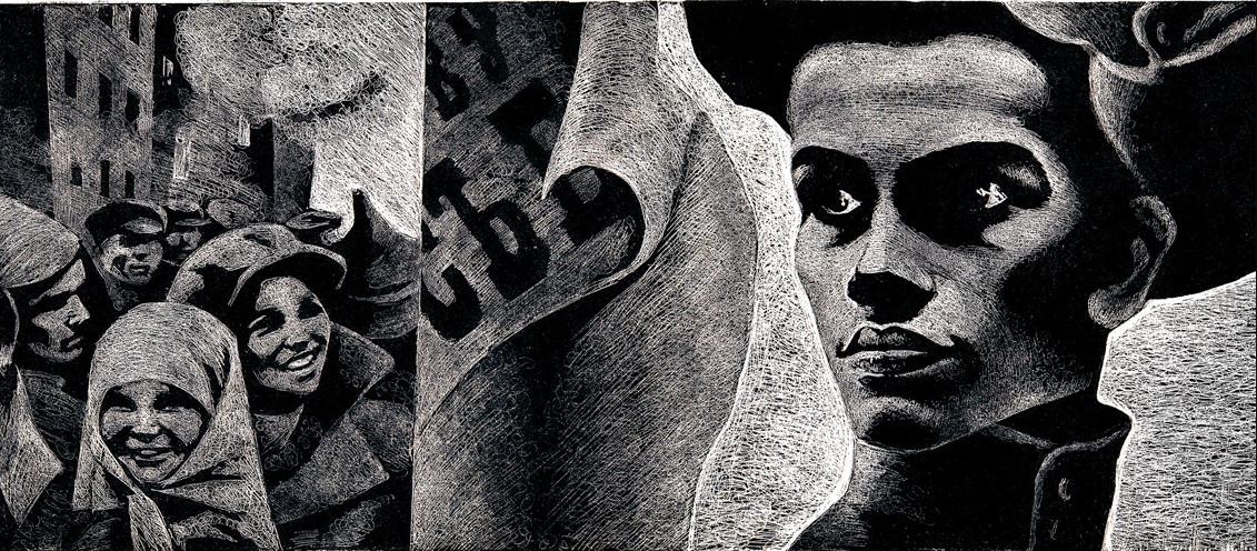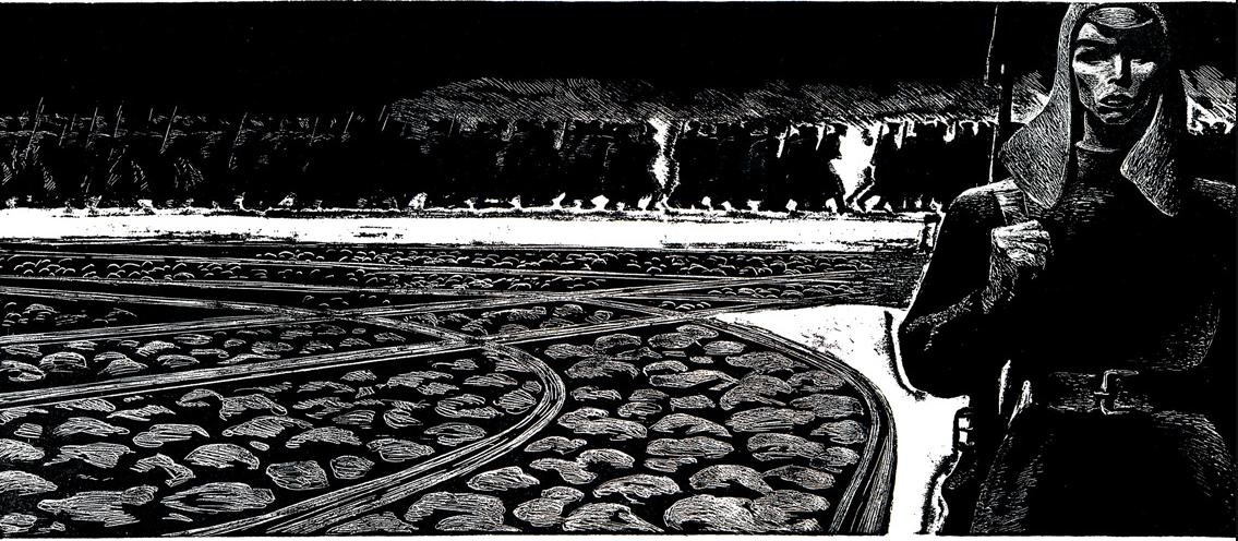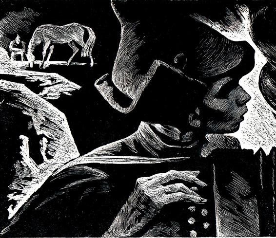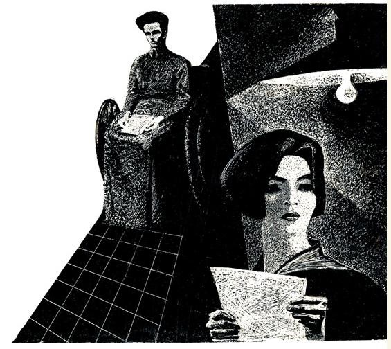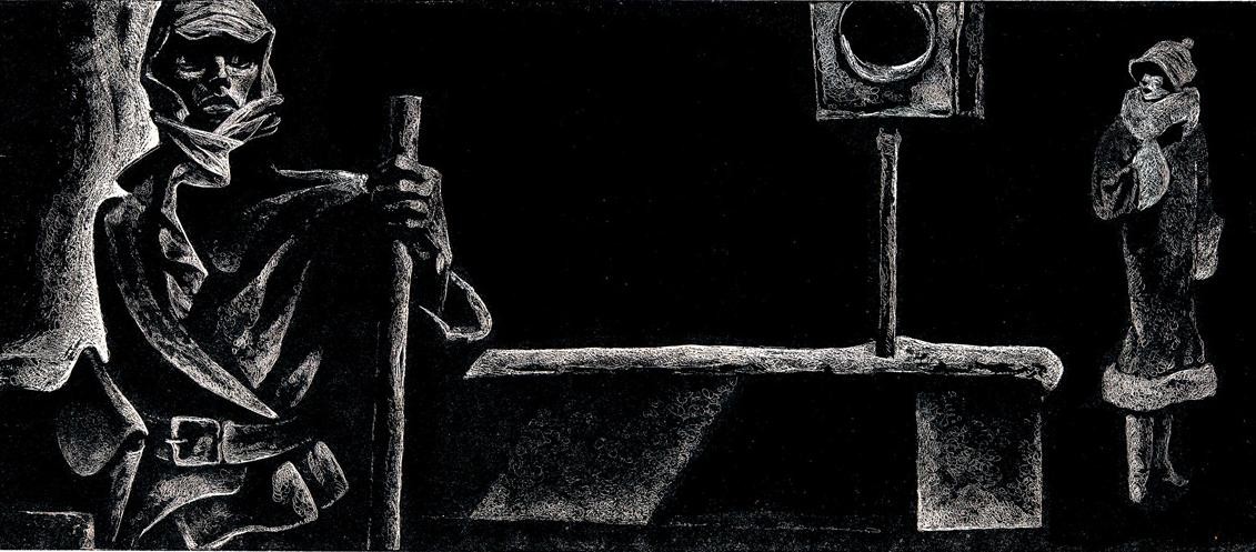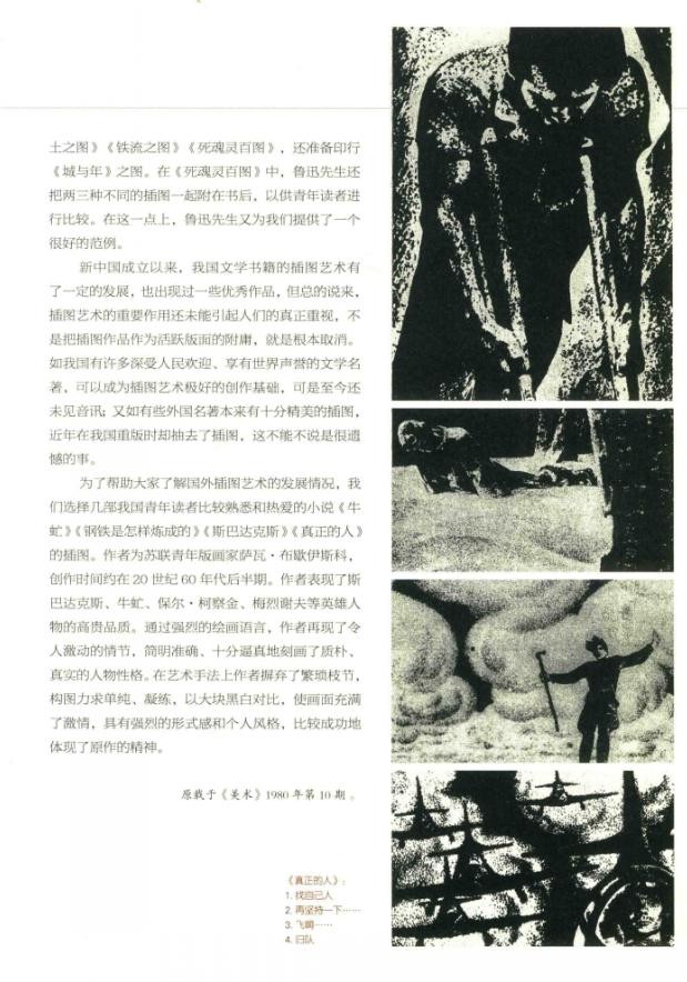 ——为了帮助大家了解国外插图艺术的发展情况,我们选择几部我国青年读者比较熟悉和热爱的小说《牛虻》《钢铁是怎样炼成的》《斯巴达克斯》《真正的人》的插图。作者为苏联青年版画家萨瓦·布歇伊斯科,创作时间约在20世纪60年代后半期。作者表现了斯巴达克斯、牛虻、保尔·柯察金、梅烈谢夫等英雄人物的高贵品质。通过强烈的绘画语言,作者再现了令人激动的情节,简明准确、十分逼真地刻画了质朴、真实的人物性格。在艺术手法上作者摒弃了繁琐枝节,构图力求单纯、凝练,以大块黑白对比,使画面充满了激情,具有强烈的形式感和个人风格,比较成功地体现了原作的精神。——