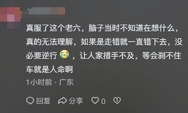 真服了这个老六,脑子当时不知道在想什么,真的无法理解,如果是走错就一直错下去,没必要逆行,让人家措手不及,等会刹不住车就是人命啊