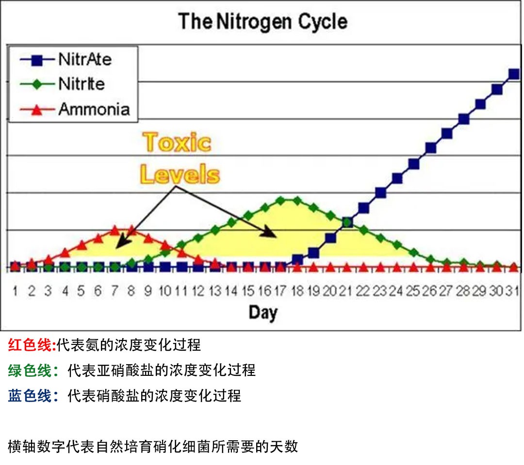 与上图类似的图相信很多鱼友都见过,这是自然培养硝化细菌的工作流程及时间图。