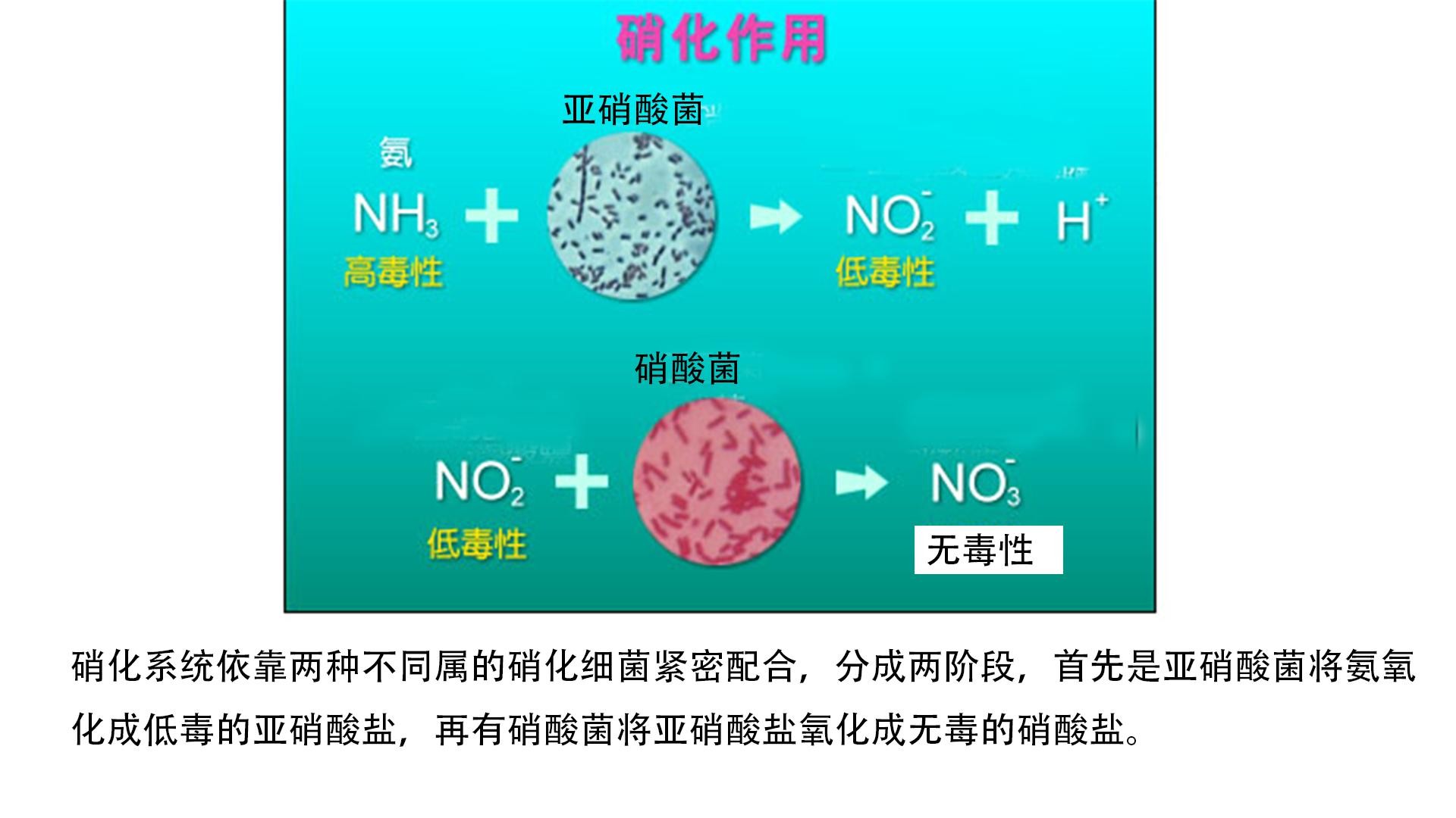 亚硝酸菌属的作用是将鱼排泄、呼吸等产生的剧毒氨氮氧化为亚硝酸盐,这里要清楚的是氨氮是无色无味的剧毒物质,硝化细菌不具备能力分解肉眼看见的粪便物质。因此硝化细菌培养成功的第一步是亚硝酸菌属首先在鱼缸内产生,并能将鱼缸内的氨氮快速高效的氧化成亚硝酸盐。