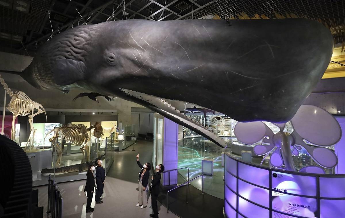 经过几千万年的进化,目前鲸豚类生物近百种,分为须鲸和齿鲸,须鲸的代表要属蓝鲸,它们将海水吞入口中,用须板过滤后,吞食剩下的鱼虾,而齿鲸代表非抹香鲸莫属,它们最主要的食物是海中的头足类生物,当然也包括大王乌贼。