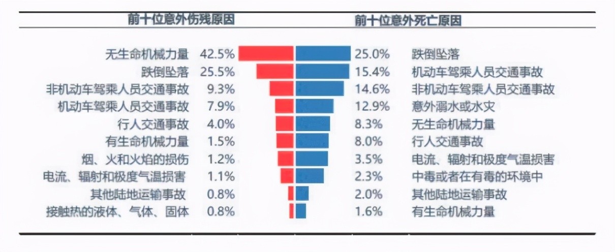 根据中国保险行业协会在2017年发布的《中国保险人群意外伤害风险研究报告》,从事故原因的分解可以看出,坠落是事故风险的首要原因;
