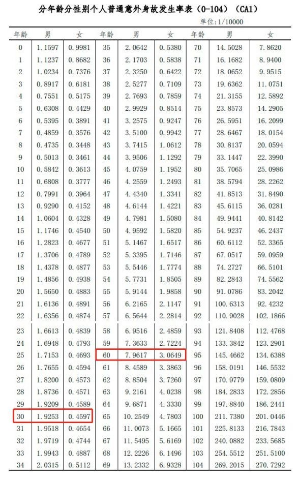 比如30岁的男性,发生意外身故的概率为万分之1.9253;